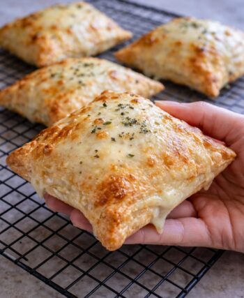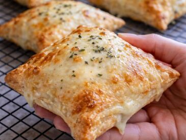 L’image présente de délicieux feuilletés carrés, parfaitement dorés, garnis de fromage fondant qui déborde légèrement …