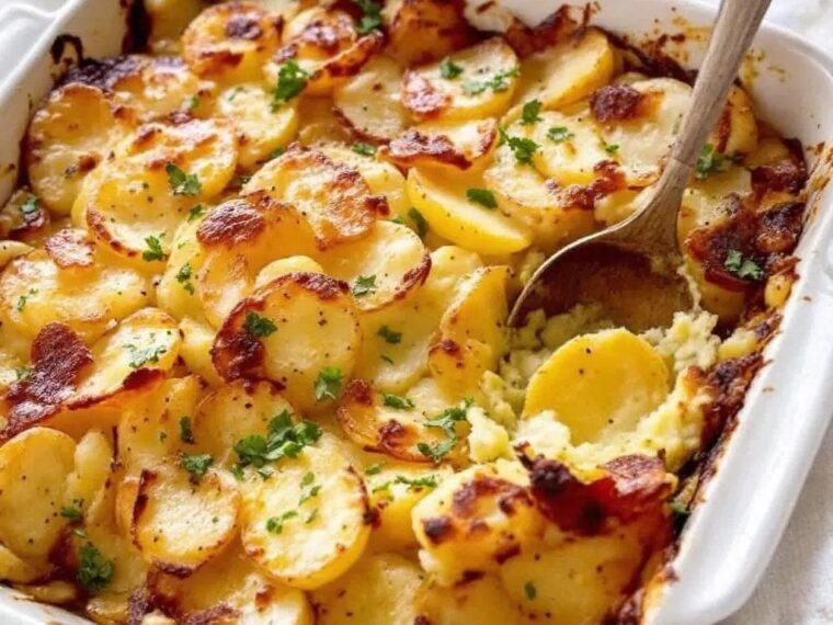 Doré à la perfection, crémeux à l’intérieur, légèrement croustillant sur le dessus… Ce gratin de pommes de terre est le plat réconfortant par excellence. Sur l’image, on aperçoit de fines rondelles de pommes de terre nappées d’une sauce crémeuse, gratinées au four jusqu’à obtenir une belle croûte dorée, puis parsemées de persil frais.