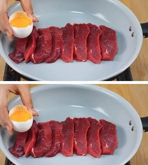 Sur l’image, on voit une série de morceaux de viande rouge disposés dans une poêle, et une main versant un jaune d’œuf battu dessus. Ce n’est pas une erreur : c’est l’astuce principale !