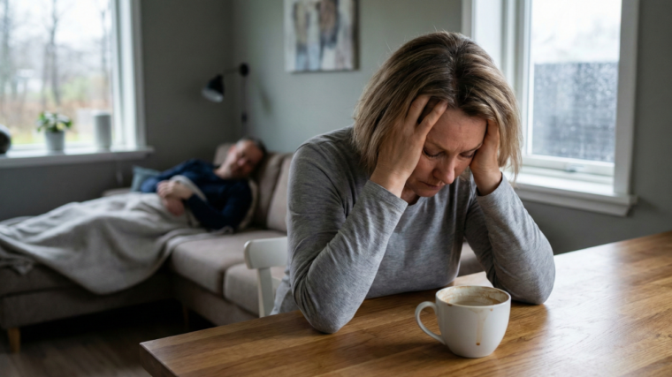 L’image montre une femme visiblement Ă©puisĂ©e, la tĂŞte entre les mains, une tasse de cafĂ© …