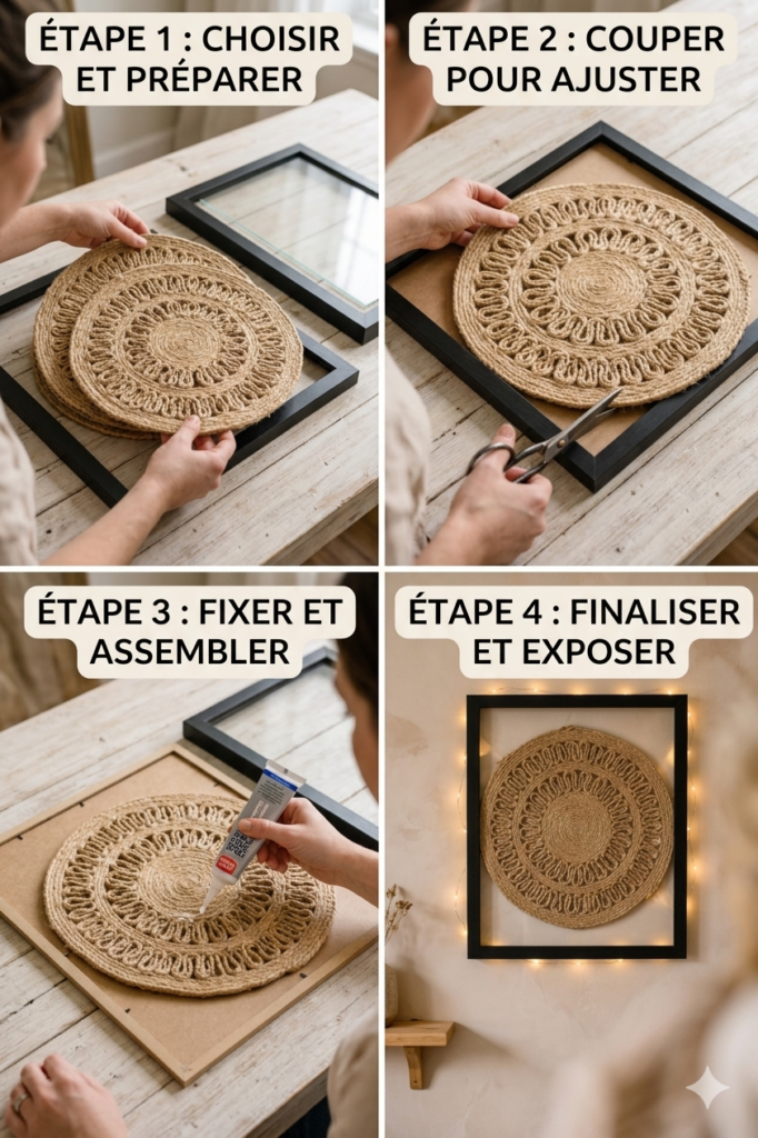 Ce DIY prouve qu’il est possible de créer une décoration élégante avec très peu de moyens. En utilisant des sets de table simples et un cadre, vous pouvez concevoir une œuvre unique qui attire le regard.